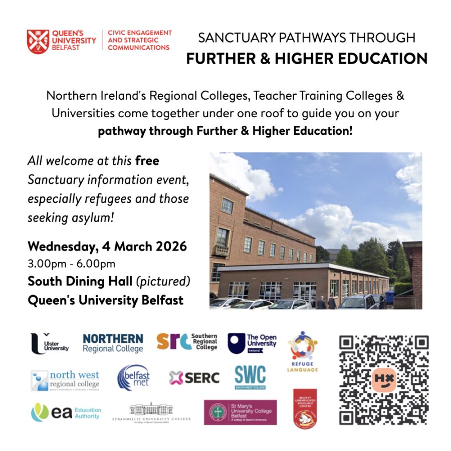 Whether you are just starting out, returning to education, or planning your next step, join us for Sanctuary Pathways, a welcoming event bringing together representatives from regional Further Education colleges, teacher‑training colleges, universities, the Education Authority, and a number of ESOL providers. You’ll be able to speak directly with the organisations who can support you. The event is open to all, including refugees, asylum seekers, and anyone experiencing challenges accessing education beyond school. Whatever stage you’re at, whatever qualifications you have, come along and let us help you map your pathway through Further and Higher Education.