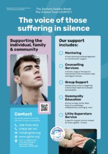 Zachary Geddis Break the Silence Trust are a charity based in Coleraine set up to provide services for those in the local community who are experiencing mental health issues, raise awareness of mental health within Northern Ireland and decrease the stigma around suicide. We provide immediate mental health services across the Causeway Coast and Glens with an average of 150 clients per week being supported through counselling, mentoring and therapy groups.